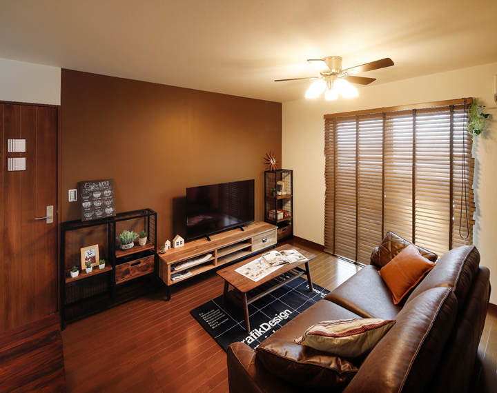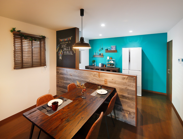 緑の壁紙とブラウンのダイニングテーブルや床がアクセントとなり、部屋全体をおしゃれなものにする