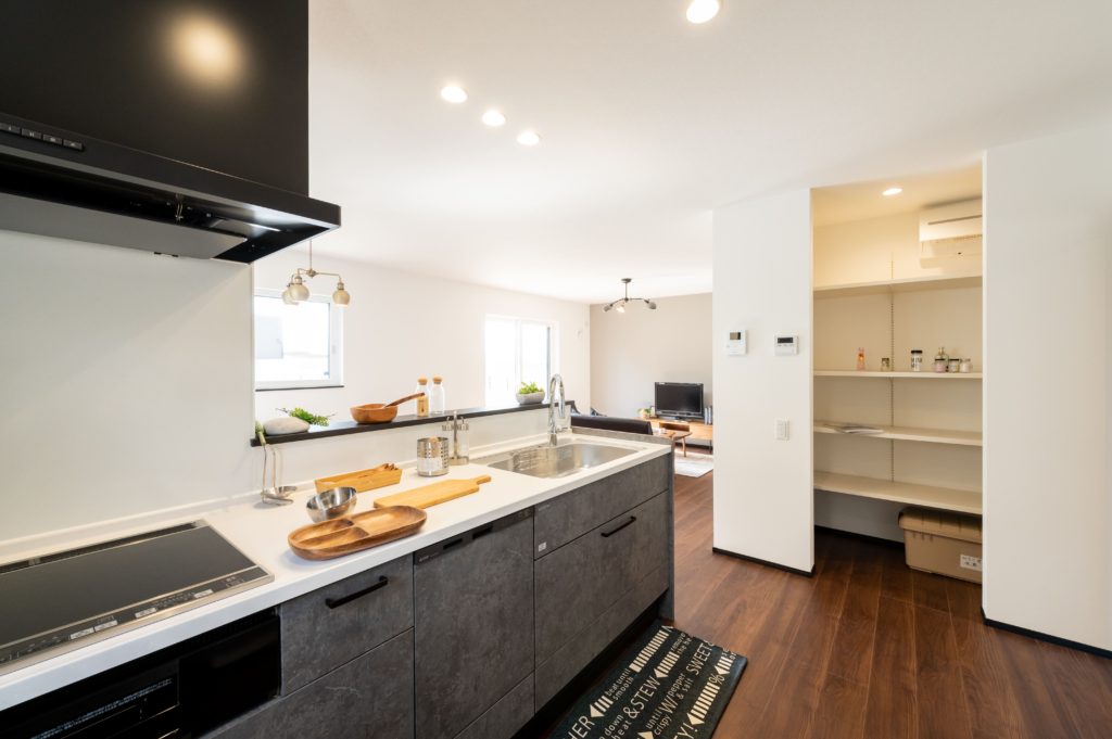 落ち着いたイメージのキッチンと大きめのパントリー